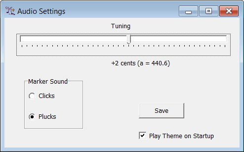 Move the "Tuning" slider to choose the overall pitch the accompaniment will use. This setting will affect the pitch of the audio created by M+O in the future. The pitch level is displayed both as a change in "cents" (there are 100 cents in a semitone or half step), and as the frequency, in Hz or cycles per second, of the corresponding tuning "A." You shouldn't take this latter number too literally: if you make no change to the tuning level, the Audio Settings display calls this A=440 Hz. Whether or not this is 440 Hz in reality depends on the tuning of the original accompaniment recording. However, +2 cents does literally mean that audio is played back 2 cents higher than it was originally recorded.